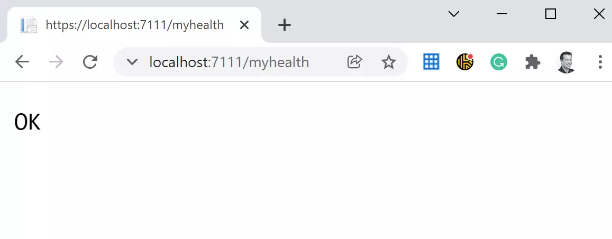 var pipeline = endpoints.CreateApplicationBuilder().UseMiddleware().Build(); return endpoints.Map(pattern, pipeline).WithDisplayName("My custom health checks");這種方法允許我們?yōu)檫@個(gè)新的管道添加更多的中間件。WithDisplayName擴(kuò)展方法將配置的顯示名稱設(shè)置為接口,接下來按F5鍵啟動(dòng)程序,并在瀏覽器中調(diào)用https://localhost:7111/myhealth。我們將看到:
