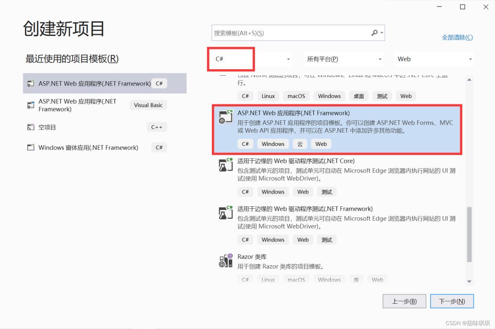 - 二、選擇語(yǔ)言為C#,然后選擇“ASP.NET Web應(yīng)用程序(.NET Framework)”