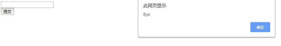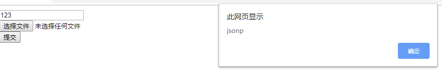 <body> <form action="/" method="post" enctype="multipart/form-data" id="form"> <input type="text" name="xinxi" id="info"><br> <input type="button" value="提交" name="submit" id="btn"> </form></body><script src="./jquery.js"></script><script> $("#btn").on("click", function () { $.ajax({ url: "http://soul:8888/kuayu", type:"delete", async:false, success: function (data) { alert(data); },}) })</script>效果: