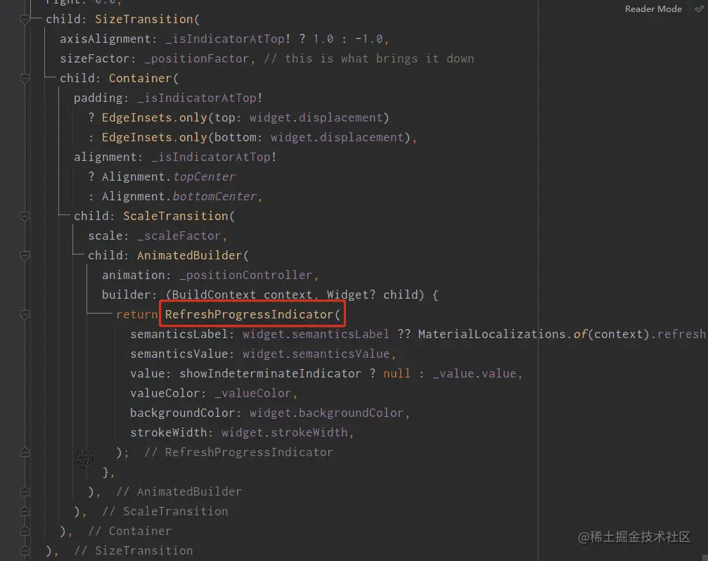 簡單的樣式修改,如想換成順時(shí)針旋轉(zhuǎn)的 iOS 風(fēng)格活動(dòng)指示器,只需替換對應(yīng)樣式代碼即可。查看RefreshIndicator的源碼,代碼翻到最下面就可以看到其實(shí)是自定義了一個(gè)RefreshProgressIndicator樣式,通過繼承CircularProgressIndicator來實(shí)現(xiàn)初始樣式。