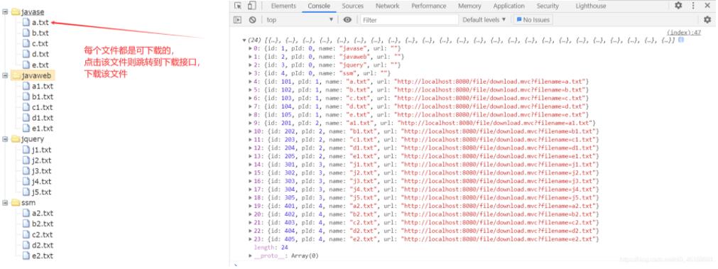 /** * @author compass * @version 1.0 * @date 2021-05-15 12:31 */public class FilerService { // 將構建為文件對象的文件或目錄放到list集合中 List<MyFile> fileList = new ArrayList<>(); /** * 功能:遞歸遍歷文件,并且將文件或目錄按照規定構建為對象 撞到List集合返回 * @param file 待遍歷的文件夾 * @param index 掃描文件賦值指針 初始值為 :1 * @return */ public List<MyFile> listAll1(File file , int index) {File[] listFiles= file.listFiles();// 將文件或目錄構建為對象for (int i=1;i<listFiles.length+1;i++){ if (listFiles[i-1].isDirectory()){// 如果是目錄 則url為空 pid=0說明是根目錄MyFile myFile = new MyFile(i,0,listFiles[i-1].getName(),"");fileList.add(myFile); }else {// 如果是文件則拼接下載地址String filename=listFiles[i-1].getName();// 文件的id為:(目錄id*100)+文件序列MyFile myFile = new MyFile((100*index)+i,index,listFiles[i-1].getName(),"http://localhost:8080/file/download.mvc?filename="+filename);fileList.add(myFile); }}// 判斷該文件是否存在if (file.exists()){ // 獲取當前文件夾下的所有子文件 File[] files = file.listFiles(); if (files!=null&&files.length>0){// 對文件進行遍歷for (int i = 0; i < files.length; i++) { if (files[i].exists()&&files[i].isDirectory()){// 如果是一個目錄繼續進行遞歸 直到找到文件為止 每遍歷一個目錄 index+1listAll1(files[i],i+1); }} }}return fileList; } // 制定文件的父目錄 String parentDir=null; /** * 根據傳遞過來的文件名 找到該文件的父文件夾,如果沒有找到返回null * @param fileName 文件名 * @param dir 需要查找的目錄 * @return */ public String getFileName(String fileName,File dir){if (dir.exists()){ File[] files = dir.listFiles(); if (files!=null&&files.length>0){for (int i=0;i<files.length;i++){ if (files[i].exists()&&files[i].isDirectory()){getFileName(fileName,files[i]); }else {// 如果找到傳遞過來的文件名則賦值給 parentDirif (fileName.equals(files[i].getName())){ parentDir=files[i].getParent(); break;} }} } }return parentDir; }}3.下載和渲染數據的Controller