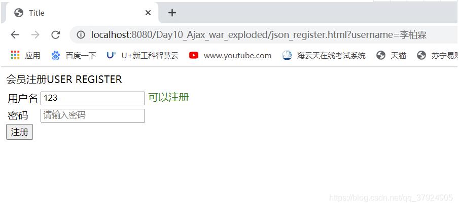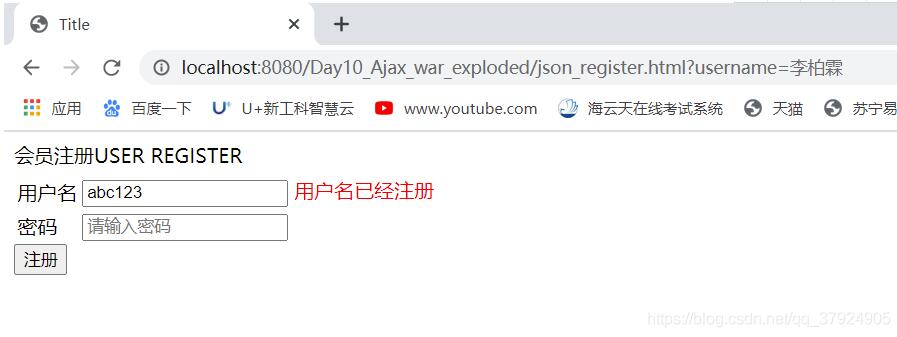 <!DOCTYPE html><html lang="en"><head> <meta charset="UTF-8"> <title>Title</title> <script src="js/jquery-3.3.1.js"></script> <script type="application/javascript"> $(function () { //1: 給用戶名輸入框綁定失去焦點事件(onfocus onblur) $("#username").on("blur",function () {//獲取用戶名輸入框數據var username = $("#username").val();//2:向服務器發出異步請求,讓服務器去查詢用戶名是否存在$.post( "register", //表示服務器的servlet路徑 "username="+username, //表示向服務器發送的數據 function (data) { // msg:用戶名已經注冊 code:0 if(data.code==0){ // alert(data.info); $("#spanId").html(data.msg).css("color","green"); }else { $("#spanId").html(data.msg).css("color","red"); } }, "json"); }); }); </script></head><body><div> <font>會員注冊</font>USER REGISTER <form> <table> <tr><td>用戶名</td><td> <input type="text" id="username" name="username" placeholder="請輸入用戶名"> <span id="spanId"></span></td> </tr> <tr><td>密碼</td><td> <input type="password" placeholder="請輸入密碼"></td> </tr> </table> <input type="submit" value="注冊"/> </form></div></body></html>運行效果: