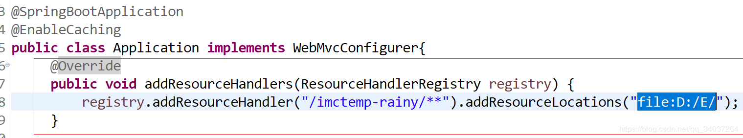 @Override public void addResourceHandlers(ResourceHandlerRegistry registry) { registry.addResourceHandler("/imctemp-rainy/**").addResourceLocations("file:D:/E/"); }設(shè)置靜態(tài)資源路徑