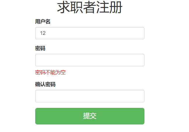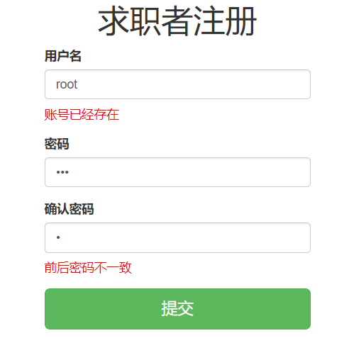 <form role="form" action="userController/insert.do"> <div> <label for="exampleInputEmail1">用戶名</label><input name="username" type="text" id="exampleInputEmail1" onblur="check(this)"/> <h5 id = "usernameInfo"></h4> </div> <div> <label for="exampleInputPassword1">密碼</label><input name="password" type="password" id="exampleInputPassword1" onblur="check(this)"/> <h5 id="passInfo"></h4> </div> <div> <label for="exampleInputPassword1">確認(rèn)密碼</label><input name="repassword" type="password" id="exampleInputPassword2" onblur="check(this)"/> <h5 id="repassInfo"></label> </div> <button type="submit">提交</button></form>