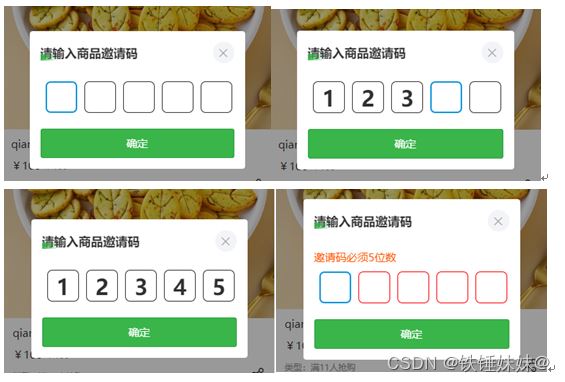 <template> <view> <view> <view>請(qǐng)輸入商品邀請(qǐng)碼</view> <view @click="codeInputClose"><uni-icons type="closeempty" size="30" color="#999999" /> </view> </view> <!-- 錯(cuò)誤提示 --> <view v-if="codeColor == "#ff0000"&& !isNum">邀請(qǐng)碼必須{{ codeLength }}位數(shù)</view> <view v-if="codeColor == "#ff0000"&& isNum ">邀請(qǐng)碼必須是數(shù)字</view> <view> <viewv-for="(item, index) in codeLength":key="index" :style="(index == intviation_code.length? "border: 5rpx solid #1195db; width: 88rpx; height: 88rpx; line-height: 80rpx;":"color: " + codeColor + ";" +"border: 2rpx solid" + codeColor)"@click="focus = true" >{{ intviation_code[index] && intviation_code[index] || "" }}</view> <input type="tel"v-model="intviation_code":maxlength="codeLength":focus="focus":cursor="intviation_code.length"@focus="focus = true "@blur="focus = false" /> </view> <button :class="["submit_code_btn", disabled ? "btn_disabled" : ""]" :disabled="disabled" @click="submitGoodCode" >確定</button> </view></template><script>export default { data() { return { codeColor: "#313131", //自定義錯(cuò)誤碼顏色 intviation_code: "", //用戶輸入的驗(yàn)證碼 focus: false, // 動(dòng)態(tài)獲取焦點(diǎn)的值 isNum: false, } }, props: { codeLength: { type: Number, default: 5, }, disabled: { type: Boolean, default: false, }, }, methods: { codeInputClose() { this.intviation_code = "" this.$emit("codeInputClose") }, submitGoodCode() { if (this.intviation_code.length === this.codeLength) {if (Number(this.intviation_code)) { this.$emit("submitGoodCode", this.intviation_code)} else { this.isNum = true this.publicErrorSetting()} } else {this.publicErrorSetting() } }, // 輸入不符合規(guī)范,更改樣式并清空 publicErrorSetting() { this.codeColor = "#ff0000" setTimeout(() => {this.intviation_code = ""this.codeColor = "#313131"this.isNum = false }, 1000) }, },}</script><style lang="scss" scoped>.code-popup-top { display: flex; justify-content: space-between; align-items: center; margin-bottom: 50upx; .code-title { font-size: 34upx; color: #333; font-weight: bold; position: relative; &::before { content: ""; position: absolute; bottom: 0; width: 40upx; height: 19upx; background: linear-gradient(to right,rgba(57, 181, 74, 1),rgba(57, 181, 74, 0.1) ); } } .close-icon { background: #f2f4f7; border-radius: 50%; display: flex; align-items: center; justify-content: center; }}.code_errow { font-size: 30upx; color: #ff5500; margin-bottom: 20upx;}.submit_code_btn { width: 100%; height: 83upx; line-height: 83upx; border-radius: 7upx; background: #39b54a; color: #fff; font-size: 31upx; text-align: center; margin-top: 45upx;}.btn_disabled { color: rgba(255, 255, 255, 0.5) !important; background-color: rgba(57, 181, 74, 0.4) !important;}.code_input_con { display: flex; justify-content: space-around; position: relative; .code_input_item { margin-left: 10upx; text-align: center; line-height: 88upx; border-radius: 14upx; width: 88upx; height: 88upx; font-size: 60upx; font-weight: bold; color: #333; &:last-child { margin-right: 0; } } /*input隱藏掉*/ .cinput { position: absolute; top: 0; left: -100%; width: 100%; height: 100%; }}</style>四. 過(guò)程中遇到的問(wèn)題