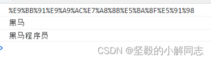 let str = "黑馬程序員";let str2 = encodeURI(str)console.log(str2);//utf-8一個漢字占三個字節 ,寫六個是黑馬兩個字。let str3 = decodeURI("%E9%BB%91%E9%A9%AC")let str4 = decodeURI(str2)console.log(str3);console.log(str4);