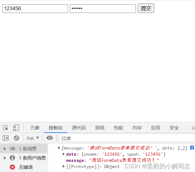 var form = document.querySelector("#form1")form.addEventListener("submit", function (e) { e.preventDefault(); //創建對象,獲取數據。 let fd = new FormData(form); let xhr = new XMLHttpRequest(); xhr.open("post", "http://www.liulongbin.top:3006/api/formdata") xhr.send(fd) xhr.onreadystatechange = function () {if (xhr.readyState === 4 && xhr.status === 200) { console.log(JSON.parse(xhr.responseText));} }})
