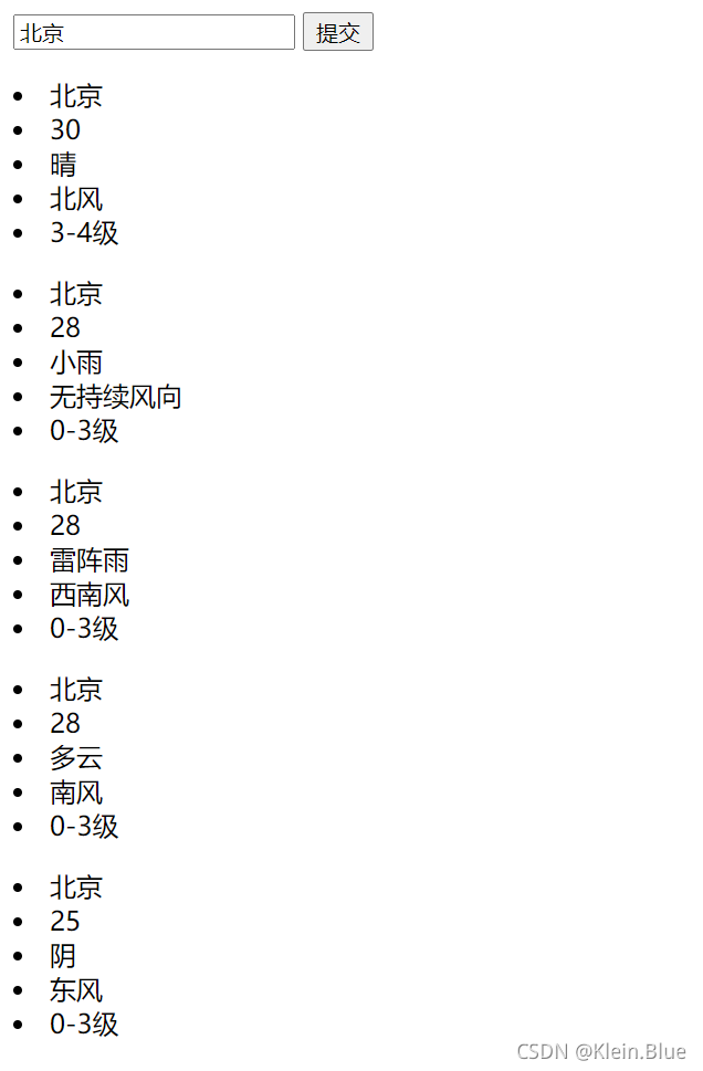var text = $("#text")var btn = $("#button")var div = $("#div1")btn.click(function(){var url = "https://api.apishop.net/common/weather/get15DaysWeatherByArea?apiKey=******&area="$.post(url,{ // 傳入必須的參數 area:text.val()}, function(response){ console.log(response) var list = response.result.dayList; console.log(list) for(var i = 0; i < list.length; i++){div.append("<ul>")div.append("<li>" + list[i].area + "</li>")div.append("<li>" + list[i].day_air_temperature + "</li>")div.append("<li>" + list[i].day_weather + "</li>")div.append("<li>" + list[i].day_wind_direction + "</li>")div.append("<li>" + list[i].day_wind_power + "</li>")div.append("</ul>") }}, "JSON") })結果截圖: