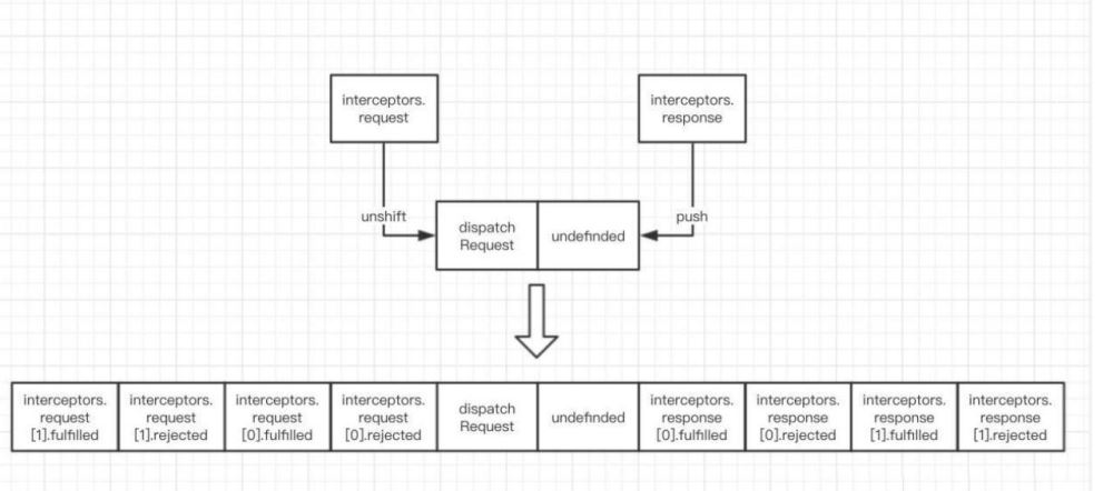 - 最核心的數(shù)組chain,這個(gè)數(shù)組中保存了請(qǐng)求攔截器、響應(yīng)攔截器和發(fā)送請(qǐng)求函數(shù)。該數(shù)組中間放的是發(fā)送請(qǐng)求的函數(shù),左邊放的是請(qǐng)求攔截器,右邊放的是響應(yīng)攔截器。在第一步中返回的Promise對(duì)象,將遍歷chain數(shù)組逐一執(zhí)行里面的函數(shù),并返回新的Promise對(duì)象