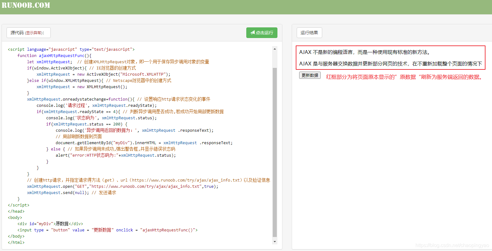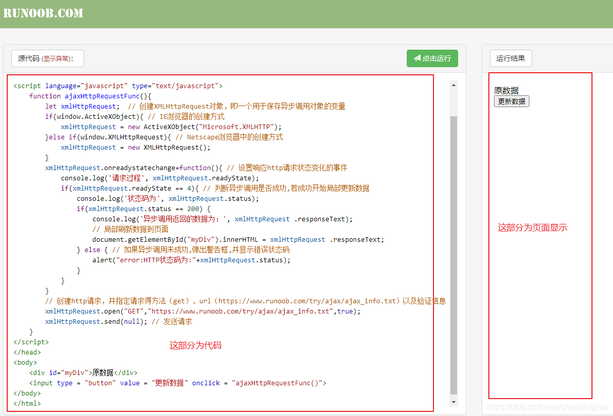<html><head><title>AJAX實例</title><script language="javascript" type="text/javascript"> function ajaxHttpRequestFunc(){ let xmlHttpRequest; // 創建XMLHttpRequest對象,即一個用于保存異步調用對象的變量 if(window.ActiveXObject){ // IE瀏覽器的創建方式 xmlHttpRequest = new ActiveXObject("Microsoft.XMLHTTP");}else if(window.XMLHttpRequest){ // Netscape瀏覽器中的創建方式 xmlHttpRequest = new XMLHttpRequest();} xmlHttpRequest.onreadystatechange=function(){ // 設置響應http請求狀態變化的事件 console.log("請求過程", xmlHttpRequest.readyState); if(xmlHttpRequest.readyState == 4){ // 判斷異步調用是否成功,若成功開始局部更新數據 console.log("狀態碼為", xmlHttpRequest.status); if(xmlHttpRequest.status == 200) { console.log("異步調用返回的數據為:", xmlHttpRequest .responseText); document.getElementById("myDiv").innerHTML = xmlHttpRequest .responseText; // 局部刷新數據到頁面 } else { // 如果異步調用未成功,彈出警告框,并顯示錯誤狀態碼 alert("error:HTTP狀態碼為:"+xmlHttpRequest.status); } } } xmlHttpRequest.open("GET","https://www.runoob.com/try/ajax/ajax_info.txt",true); // 創建http請求,并指定請求得方法(get)、url(https://www.runoob.com/try/ajax/ajax_info.txt)以及驗證信息 xmlHttpRequest.send(null); // 發送請求 }</script></head><body> <div id="myDiv">原數據</div> <input type = "button" value = "更新數據" onclick = "ajaxHttpRequestFunc()"></body></html>直接運行該段代碼可能會出現跨域的現象,控制臺的報錯信息如下: