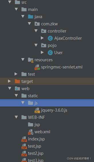 項目結構如下 (需要導入一個JQuery的包,配置文件web.xml和springmvc-servlet.xml,不在寫了,不知道的可以看一下我其它的博客,上邊都有)