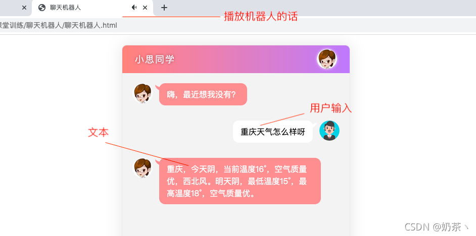 // 為發送按鈕綁定鼠標點擊事件 $("#btnSend").on("click", function() { var text = $("#ipt").val().trim() if (text.length <= 0) { return $("#ipt").val("") //用戶輸入的內容為空 } // 如果用戶輸入了聊天內容,則將聊天內容追加到頁面上顯示 $("#talk_list").append("<li><img src="img/person02.png" /> <span>" + text + "</span></li>") $("#ipt").val("")//文本為空 // 重置滾動條的位置 resetui() // 發起請求,獲取聊天內容 getMsg(text) })接下來就是機器人的回復內容啦: