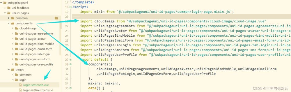 在uni-id-pages下有如下的組件,這些組件在經過分包之后,只能在子包內才能訪問,而通過uniapp的組件引入是通過easycom組件規范來引入的,詳細見如下鏈接: