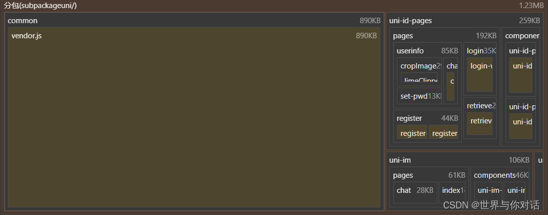 這些頁面默認都會在主包里,因為uni_modules是主包,所以該目錄下的uni-id-pages和uni-im頁面也會打包到主包里(主包里面的vendor.js會打包所有主包里面的頁面與插件的js文件),所以導致了主包里面的vendor.js在分包打包后依舊過大