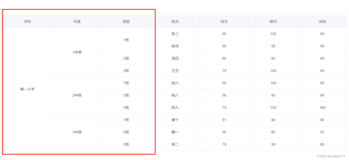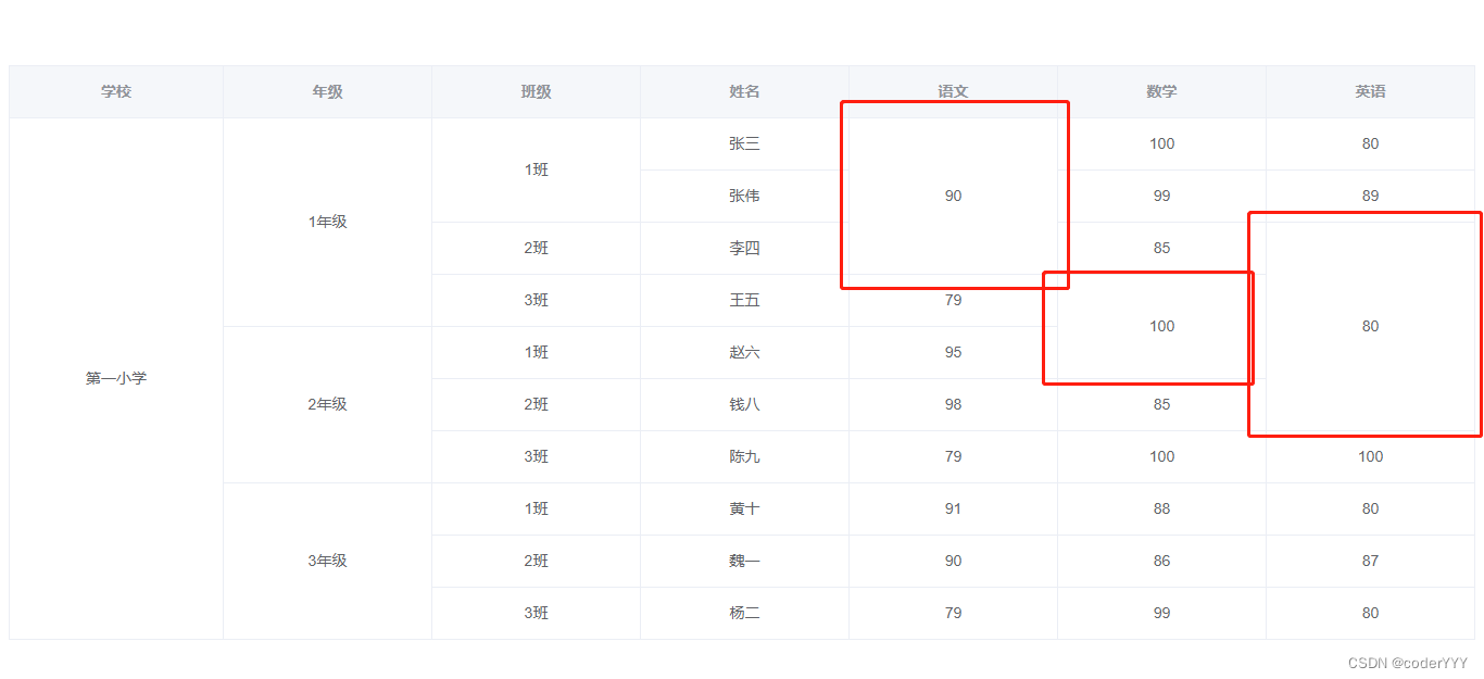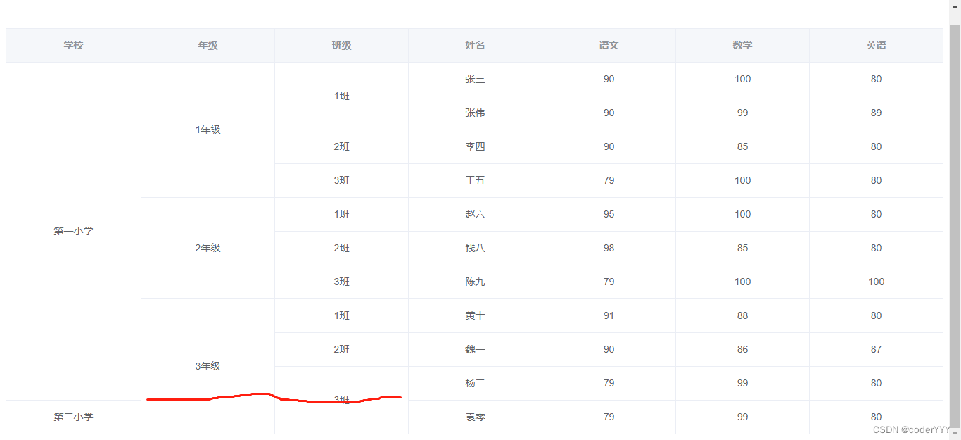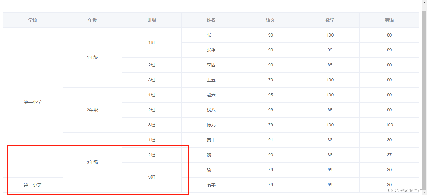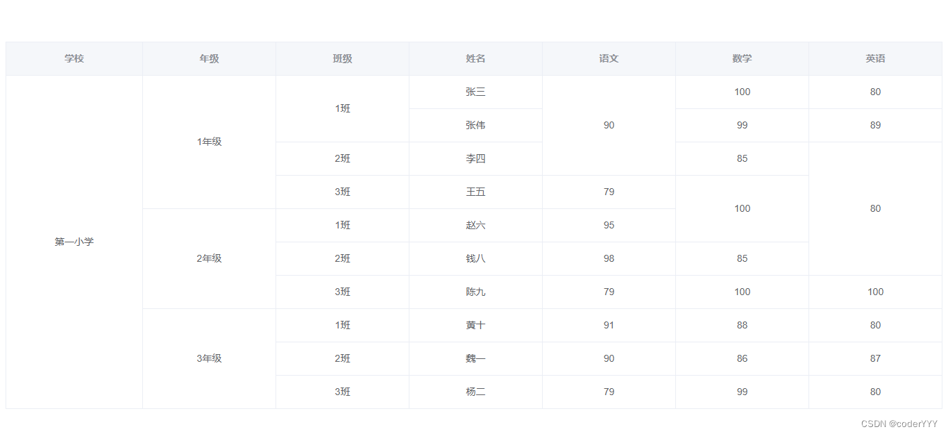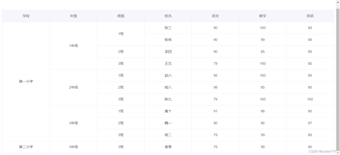 getSpanArr() { for (let i = 0; i < this.tableData.length; i++) {let row = i;// let col = i % this.colCount;if (row === 0) { // i 表示行 j表示列 for (let j = 0; j < this.colFields.length; j++) { this.spanArr[i * this.colFields.length + j] = { rowspan: 1, colspan: 1, }; }} else { for (let j = 0; j < this.colFields.length; j++) { // 當前和上一次的一樣 // 合并所有列的相同數據單元格 if ( this.colFields[j] == 'School' || this.colFields[j] == 'Grade' || this.colFields[j] == 'Class' ) { // 指定合并哪些列 if (this.tableData[row]['School'] !== this.tableData[row - 1]['School'] ) { // 哪些不合并:School不一樣的,不合并this.spanArr[row * this.colFields.length + j] = { rowspan: 1, colspan: 1,}; } else if (this.tableData[row][this.colFields[j]] ===this.tableData[row - 1][this.colFields[j]] ) {let beforeItem = this.spanArr[(row - 1) * this.colFields.length + j];this.spanArr[row * this.colFields.length + j] = { rowspan: 1 + beforeItem.rowspan,// 合并幾列 colspan: 1,// 合并幾行};beforeItem.rowspan = 0;beforeItem.colspan = 0; } else {// rowspan 和 colspan 都為1表格此單元格不合并this.spanArr[row * this.colFields.length + j] = { rowspan: 1, colspan: 1,}; } } }} } // console.log(this.spanArr); },這時候再看,就是我們想要的效果了