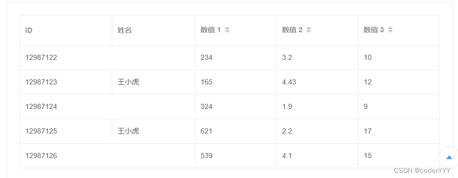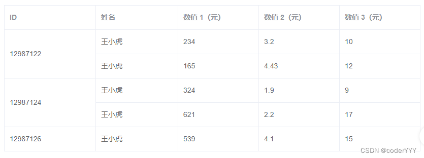 <template> <div> <el-table :data='tableData' :span-method='arraySpanMethod' border style='width: 100%'> <el-table-columnprop='id'label='ID'width='180'> </el-table-column> <el-table-columnprop='name'label='姓名'> </el-table-column> <el-table-columnprop='amount1'sortablelabel='數值 1'> </el-table-column> <el-table-columnprop='amount2'sortablelabel='數值 2'> </el-table-column> <el-table-columnprop='amount3'sortablelabel='數值 3'> </el-table-column> </el-table> <el-table :data='tableData' :span-method='objectSpanMethod' border style='width: 100%; margin-top: 20px'> <el-table-columnprop='id'label='ID'width='180'> </el-table-column> <el-table-columnprop='name'label='姓名'> </el-table-column> <el-table-columnprop='amount1'label='數值 1(元)'> </el-table-column> <el-table-columnprop='amount2'label='數值 2(元)'> </el-table-column> <el-table-columnprop='amount3'label='數值 3(元)'> </el-table-column> </el-table> </div></template><script> export default { data() { return {tableData: [{ id: '12987122', name: '王小虎', amount1: '234', amount2: '3.2', amount3: 10}, { id: '12987123', name: '王小虎', amount1: '165', amount2: '4.43', amount3: 12}, { id: '12987124', name: '王小虎', amount1: '324', amount2: '1.9', amount3: 9}, { id: '12987125', name: '王小虎', amount1: '621', amount2: '2.2', amount3: 17}, { id: '12987126', name: '王小虎', amount1: '539', amount2: '4.1', amount3: 15}] }; }, methods: { arraySpanMethod({ row, column, rowIndex, columnIndex }) {if (rowIndex % 2 === 0) { if (columnIndex === 0) { return [1, 2]; } else if (columnIndex === 1) { return [0, 0]; }} }, objectSpanMethod({ row, column, rowIndex, columnIndex }) {if (columnIndex === 0) { if (rowIndex % 2 === 0) { return { rowspan: 2, colspan: 1 }; } else { return { rowspan: 0, colspan: 0 }; }} } } };</script>運行效果: