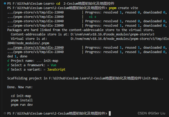 pnpm create vite接著輸入項(xiàng)目名 init-map,并根據(jù)自己的需求進(jìn)行配置。我的配置如下圖所示:
