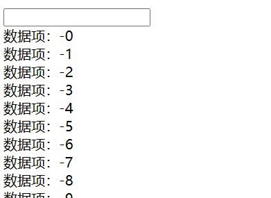import React, { useCallback, useState } from 'react'const index: React.FC = () => { const [list, setList] = useState<any[]>([]) const handleSearch = useCallback((value: string) => { const newList = [] for (let i = 0; i < 5000; i++) {newList.push(value + '-' + i) } setList(newList) }, []) return (<> <input onChange={(e) => handleSearch(e.target.value)} type='text' /> <div>{list.map(item => <div key={item}>數據項:{item}</div>)} </div></> )}export default index當我們進行持續的輸入時是十分的卡頓的,效果如下: