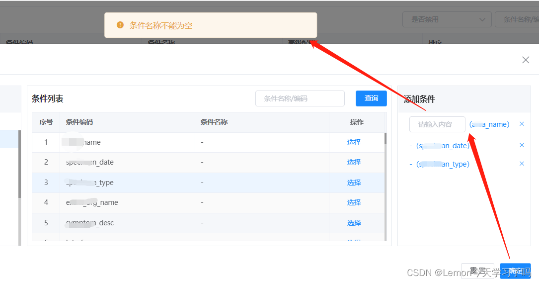 在表格中選中的數(shù)據(jù)在右邊顯示,在點(diǎn)擊確定按鈕時(shí),循環(huán)判斷沒有填寫條件名稱的數(shù)據(jù),第一個(gè)不滿足條件的顯示輸入框,且只彈出一次警告。
