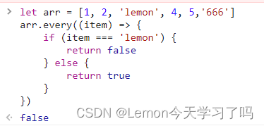 let arr = [1, 2, 'lemon', 4, 5,'666']arr.every((item) => { if (item === 'lemon') {return false } else {return true }})