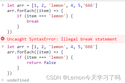 try{ // 可能會(huì)導(dǎo)致錯(cuò)誤的代碼} catch(error){ // 在錯(cuò)誤發(fā)生時(shí)怎么處理} finally { // 只要代碼中包含 finally 子句,那么無論try 還是catch 語句塊中的return 語句都將被忽略。}let arr= [1, 2, 'lemon', 4, 5,'666']try { arr.forEach(item => {// 元素達(dá)到條件時(shí)需要拋出的異常,再catch中處理if (item === 'lemon') { throw new Error('lemon')} else { throw new Error('other')} })} catch (e) { // 異常拋出時(shí)你想要做的操作 console.log(e.massage);} finally { console.log(1) //一定會(huì)執(zhí)行的操作}3. 使用some方法return true跳出循環(huán),數(shù)組里面所有的元素有一個(gè)符合條件就返回true;