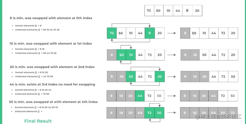 - 初始化最小數字的索引值為0,然后在數組中循環,在當前索引后面的元素中找到最小的數字的索引。