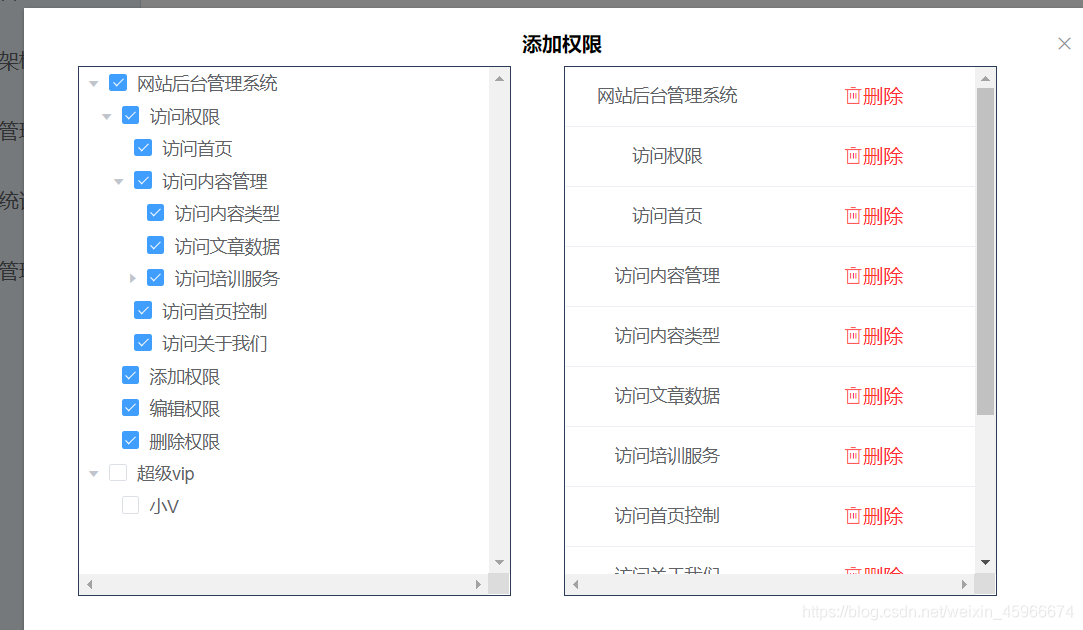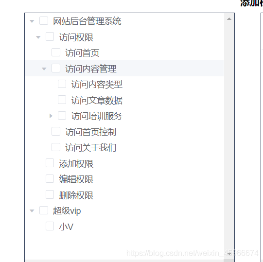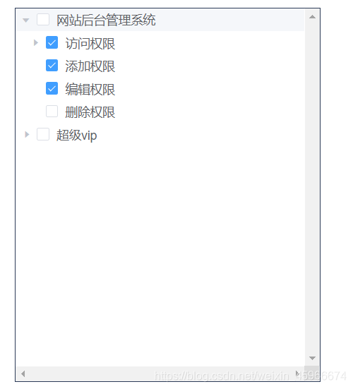 checkChange(a,b,c){//如果為取消 if(b === false){ //如果當前節點有子集 if(a.children){ //循環子集將他們的選中取消 a.children.map(item => { this.$refs.tree.setChecked(item.perId,false); }) } }else{ //否則(為選中狀態) //判斷父節點id是否為空 if(a.perParentId !== 0){ //如果不為空則將其選中 this.$refs.tree.setChecked(a.perParentId,true); } } this.tableData = this.$refs.tree.getCheckedNodes(); },setChecked方法官方文檔有詳細介紹