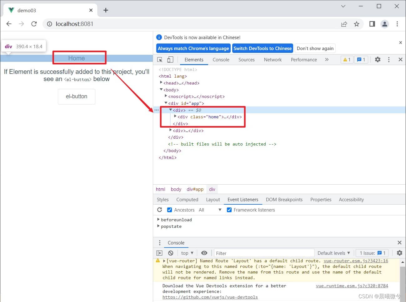//App.vue中<template> <div id='app'>//關(guān)鍵是 router-view 能否成功渲染 <router-view></router-view> <div> <p>If Element is successfully added to this project, you'll see an<code v-text=''<el-button>''></code>below </p> <el-button>el-button</el-button> </div> </div></template><script>export default { name: 'app', components: { }}</script>//index.js文件 import Vue from 'vue'import VueRouter from 'vue-router'import HomeView from '../views/main/HomeView.vue'import Layout from '../views/LayoutView.vue' Vue.use(VueRouter) //1.這里是routes,指定路徑和成員 const routes = [ { path: '/', name: 'Layout',//以下的 component(這是對的) 千萬注意,不要寫成 components(這是錯的) component: Layout, children: [ {path: '',name: 'Home',component: HomeView,meta: { isLogin: true} }, {path: 'params',name: 'params',component: () => import('../views/main/ParamsView.vue'),meta: { isLogin: true} }, {path: 'ad',name: 'ADclassify',component: () => import('../views/main/ADClassify.vue'),meta: { isLogin: true} }, {path: 'product',name: 'product',component: () => import('../views/main/ProductView.vue'),meta: { isLogin: true} } ] }, { path: '/login', name: 'Login', component: () => import('../views/LoginView.vue'), meta: { isLogin: true } }]//2.這里是router,是一個VueRouter對象const router = new VueRouter({ mode: 'history', base: process.env.BASE_URL, routes//3.這里是routes,對應(yīng)1中指定的內(nèi)容}) export default router以上,沒什么問題的話,可以看到
