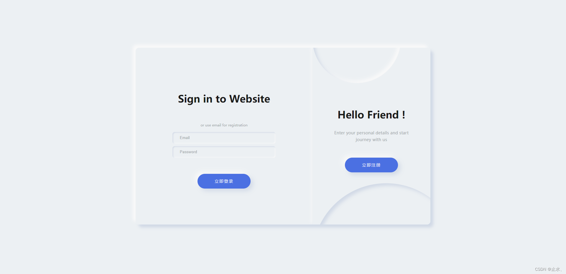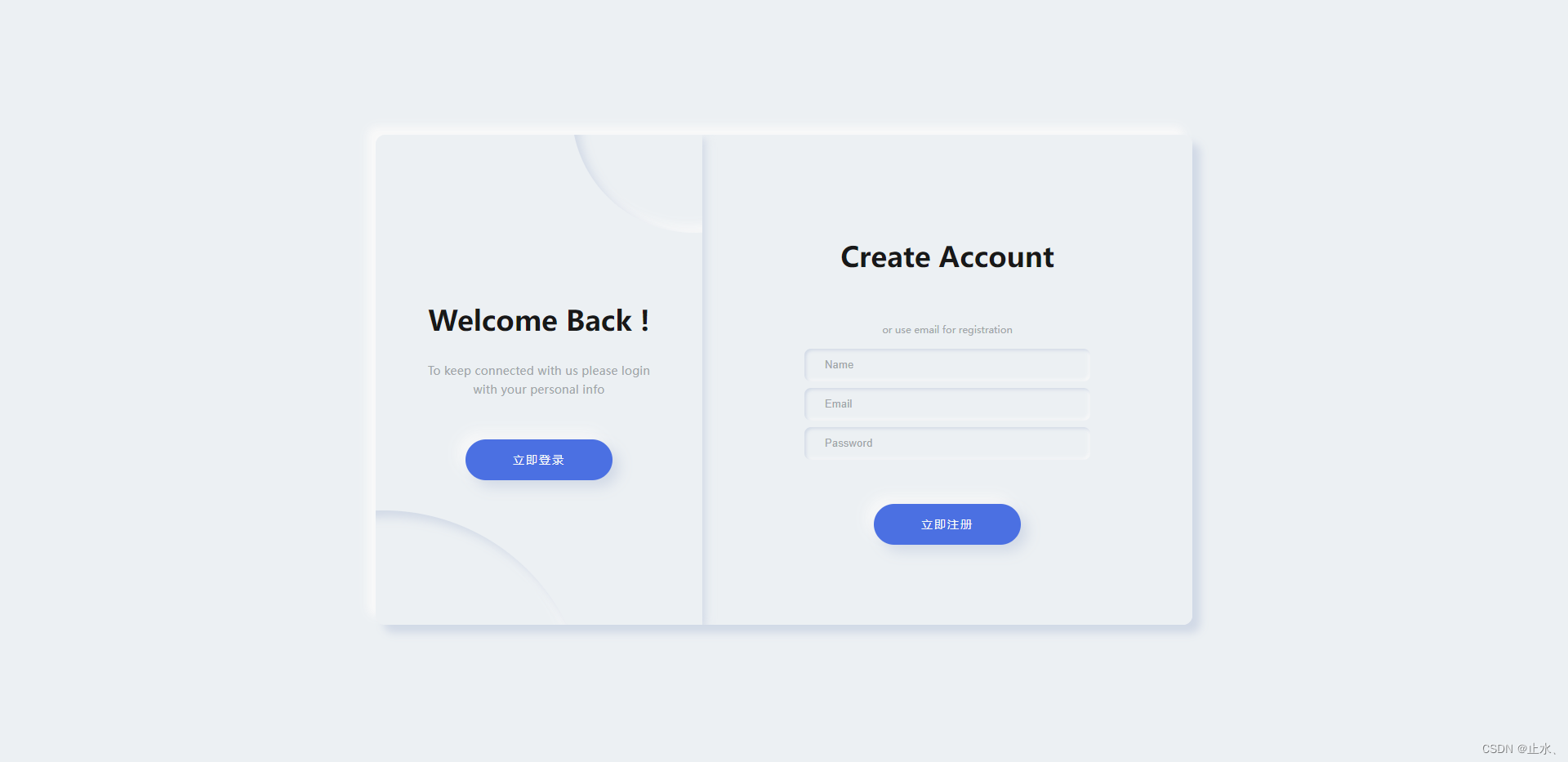 <template> <div class='main-box'> <div :class='['container', 'container-register', { 'is-txl': isLogin }]'> <form><h2 class='title'>Create Account</h2><span class='text'>or use email for registration</span><input type='text' placeholder='Name' /><input type='text' placeholder='Email' /><input type='password' placeholder='Password' /><div class='primary-btn'>立即注冊(cè)</div> </form> </div> <div :class='['container', 'container-login', { 'is-txl is-z200': isLogin }]' > <form><h2 class='title'>Sign in to Website</h2><span class='text'>or use email for registration</span><input type='text' placeholder='Email' /><input type='password' placeholder='Password' /><div class='primary-btn'>立即登錄</div> </form> </div> <div :class='['switch', { login: isLogin }]'> <div class='switch__circle'></div> <div class='switch__circle switch__circle_top'></div> <div class='switch__container'><h2>{{ isLogin ? 'Hello Friend !' : 'Welcome Back !' }}</h2><p> {{ isLogin ? 'Enter your personal details and start journey with us' : 'To keep connected with us please login with your personal info' }}</p><div @click='isLogin = !isLogin'> {{ isLogin ? '立即注冊(cè)' : '立即登錄' }}</div> </div> </div> </div></template><script>export default { name: 'LoginBox', data() { return { isLogin: false, loginForm: {email: '',password: '', }, registerForm: {name: '',email: '',password: '', }, } }, methods: { login() {}, register() {}, },}</script><style lang='scss' scoped>.main-box { position: relative; width: 1000px; min-width: 1000px; min-height: 600px; height: 600px; padding: 25px; background-color: #ecf0f3; box-shadow: 10px 10px 10px #d1d9e6, -10px -10px 10px #f9f9f9; border-radius: 12px; overflow: hidden; .container { display: flex; justify-content: center; align-items: center; position: absolute; top: 0; width: 600px; height: 100%; padding: 25px; background-color: #ecf0f3; transition: all 1.25s; form { display: flex; justify-content: center; align-items: center; flex-direction: column; width: 100%; height: 100%; color: #a0a5a8; .title {font-size: 34px;font-weight: 700;line-height: 3;color: #181818; } .text {margin-top: 30px;margin-bottom: 12px; } .form__input {width: 350px;height: 40px;margin: 4px 0;padding-left: 25px;font-size: 13px;letter-spacing: 0.15px;border: none;outline: none;// font-family: 'Montserrat', sans-serif;background-color: #ecf0f3;transition: 0.25s ease;border-radius: 8px;box-shadow: inset 2px 2px 4px #d1d9e6, inset -2px -2px 4px #f9f9f9;&::placeholder { color: #a0a5a8;} } } } .container-register { z-index: 100; left: calc(100% - 600px); } .container-login { left: calc(100% - 600px); z-index: 0; } .is-txl { left: 0; transition: 1.25s; transform-origin: right; } .is-z200 { z-index: 200; transition: 1.25s; } .switch { display: flex; justify-content: center; align-items: center; position: absolute; top: 0; left: 0; height: 100%; width: 400px; padding: 50px; z-index: 200; transition: 1.25s; background-color: #ecf0f3; overflow: hidden; box-shadow: 4px 4px 10px #d1d9e6, -4px -4px 10px #f9f9f9; color: #a0a5a8; .switch__circle { position: absolute; width: 500px; height: 500px; border-radius: 50%; background-color: #ecf0f3; box-shadow: inset 8px 8px 12px #d1d9e6, inset -8px -8px 12px #f9f9f9; bottom: -60%; left: -60%; transition: 1.25s; } .switch__circle_top { top: -30%; left: 60%; width: 300px; height: 300px; } .switch__container { display: flex; justify-content: center; align-items: center; flex-direction: column; position: absolute; width: 400px; padding: 50px 55px; transition: 1.25s; h2 {font-size: 34px;font-weight: 700;line-height: 3;color: #181818; } p {font-size: 14px;letter-spacing: 0.25px;text-align: center;line-height: 1.6; } } } .login { left: calc(100% - 400px); .switch__circle { left: 0; } } .primary-btn { width: 180px; height: 50px; border-radius: 25px; margin-top: 50px; text-align: center; line-height: 50px; font-size: 14px; letter-spacing: 2px; background-color: #4b70e2; color: #f9f9f9; cursor: pointer; box-shadow: 8px 8px 16px #d1d9e6, -8px -8px 16px #f9f9f9; &:hover { box-shadow: 4px 4px 6px 0 rgb(255 255 255 / 50%),-4px -4px 6px 0 rgb(116 125 136 / 50%),inset -4px -4px 6px 0 rgb(255 255 255 / 20%),inset 4px 4px 6px 0 rgb(0 0 0 / 40%); } }}</style>總結(jié)