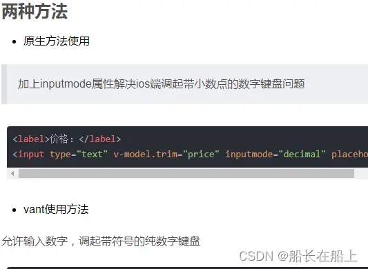<label>價格:</label><input type='text' v-model.trim='price' inputmode='decimal' placeholder='請輸入價格' @keyup='handlePrice(price)'/>vant使用方法允許輸入數字,調起帶符號的純數字鍵盤