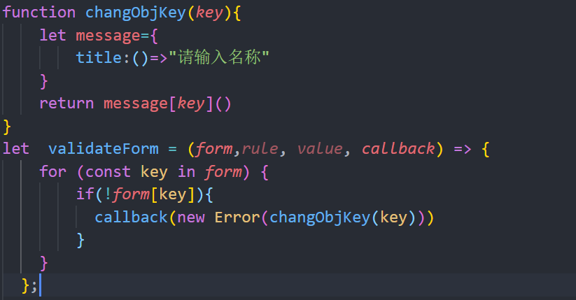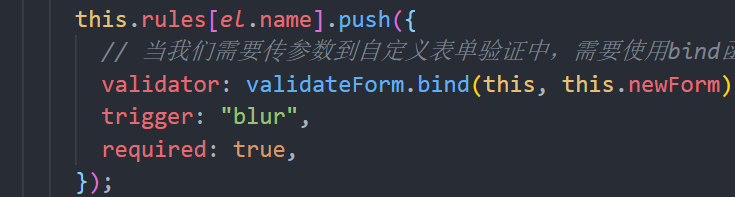例如:我要校驗的屬性是name時,在data中定義的校驗規(guī)則為rules:{name:[{validator:validateForm},trigger:"blur",required:true]},其中validateForm是自定義校驗函數。