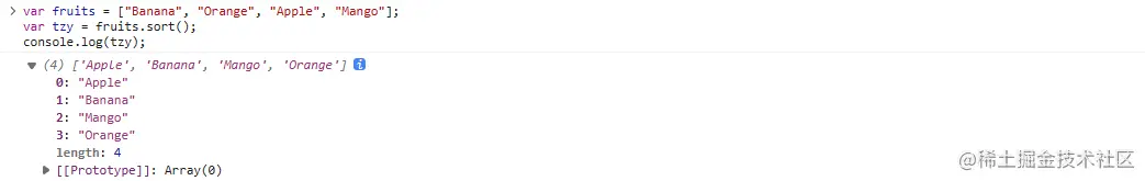 舉例排序數組var fruits = ['Banana', 'Orange', 'Apple', 'Mango'];var tzy = fruits.sort();console.log(tzy);輸出如下: