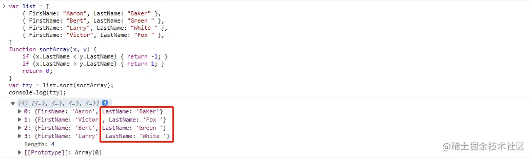 var list = [ { FirsName: 'Aaron', LastName: ',Baker' }, { FirstName: 'Bert', LastName: 'Green' }, { FirstName: 'Larry', LastName: ',White' }, { FirstName: 'Victor', LastName: 'Fox' },]function SortArray(x, y){ return x.LastName.localeCompare(y.LastName, 'fr', {ignorePunctuation: true});}var tzy = list.sort(sortArray);console.log(tzy);輸出如下: