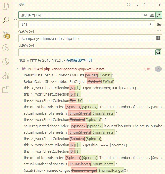 如果條件允許可以更換插件使用phpspreadsheet,如果條件不允許,我們只能修改PHPExcel里的{},使其變成[]來(lái)保證PHP7.4環(huán)境下可以使用具體操作步驟1.在PHPExcel文件夾下使用正則匹配{($[a-z][+][0-9])}找到要修改的地方