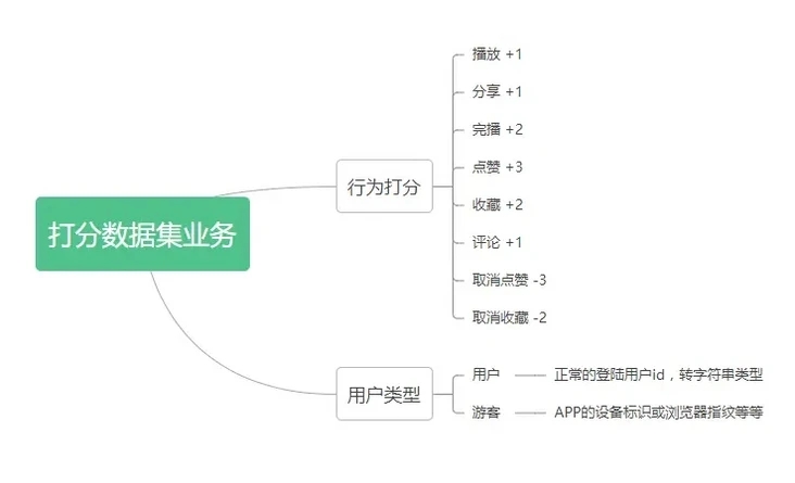 CREATE TABLE `short_video_rating` ( `id` int(11) NOT NULL AUTO_INCREMENT, `user_id` varchar(120) DEFAULT '', `item_id` int(11) DEFAULT '0', `rating` int(11) unsigned DEFAULT '0' COMMENT '評分', `scoring_set` json DEFAULT NULL COMMENT '行為集合', `create_time` int(11) DEFAULT '0', `action_day_time` int(11) DEFAULT '0' COMMENT '更新當天時間', `update_time` int(11) DEFAULT '0' COMMENT '更新時間', `delete_time` int(11) DEFAULT '0' COMMENT '刪除時間', PRIMARY KEY (`id`)) ENGINE=InnoDB AUTO_INCREMENT=107 DEFAULT CHARSET=utf8mb4 COMMENT='用戶對視頻評分表';業務介紹