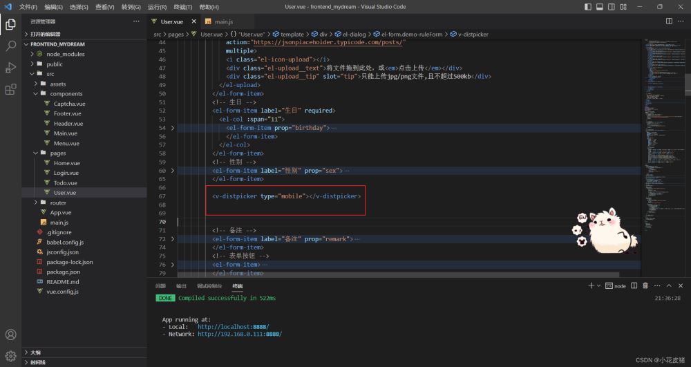 比如我現在這個組件想要使用我們注冊的公共distpicker 組件,我們就可以直接引用過來進行使用了。