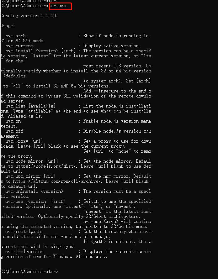 (8)以管理員權(quán)限打開cmd,然后執(zhí)行nvm,如下出現(xiàn)幫助信息,表示nvm安裝成功