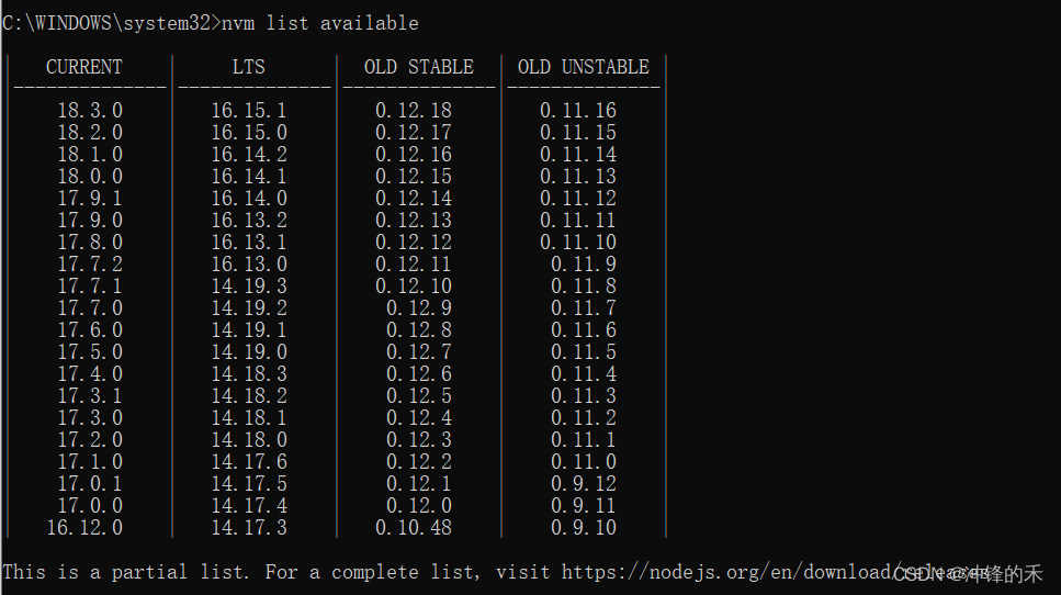 3.使用nvm list available查看可下載的版本