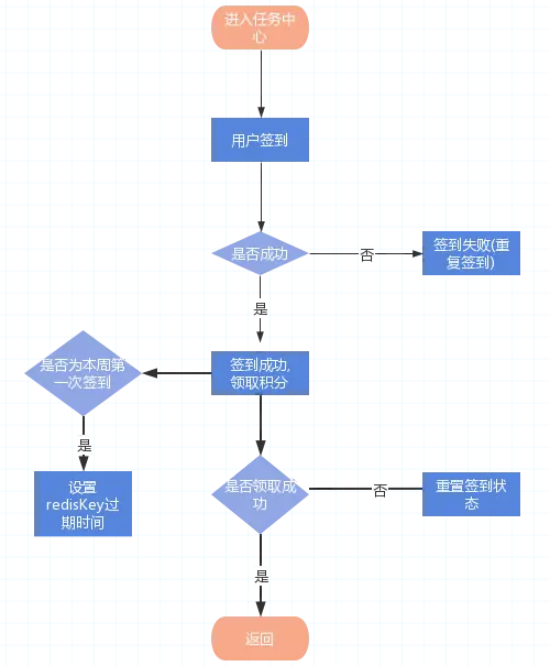 需求以自然周為周期進行簽到;展示簽到周期;重復簽到提示報錯;流程圖