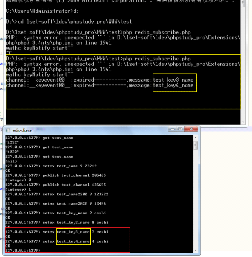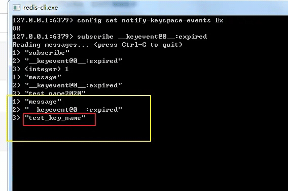 命令:setex test_key_name 30 ceshi4. 查看鍵失效回調訂閱的命令窗口是否出現失效的鍵名。