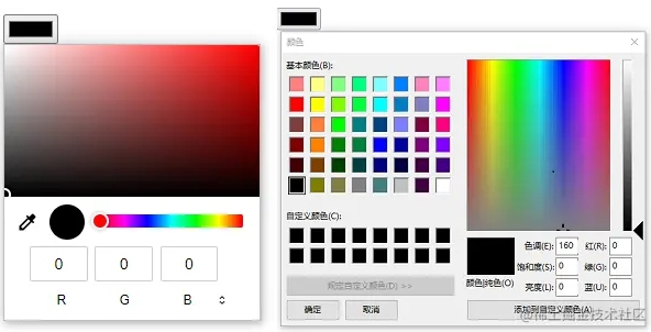 左圖是chrome的,瀏覽器自身實現(xiàn)的一個顏色選擇器控件;右圖是firefox的,引入的是操作系統(tǒng)自帶的顏色選擇器控件。