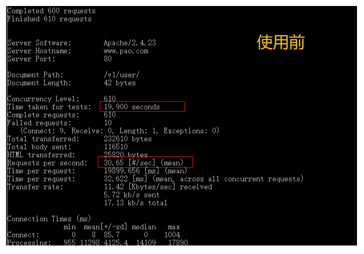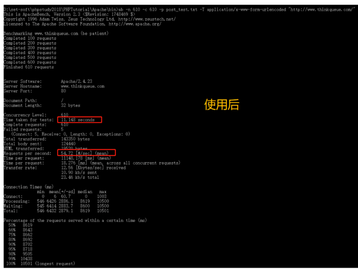 <?phpnamespace app\behavior;use think\Db;class MyQueueFailedLogger{ const should_run_hook_callback = true; /** * @param $jobObject \think\queue\Job //任務(wù)對象,保存了該任務(wù)的執(zhí)行情況和業(yè)務(wù)數(shù)據(jù) * @return bool true //是否需要刪除任務(wù)并觸發(fā)其failed() 方法 */ public function logAllFailedQueues(&$jobObject) {$failedJobLog = [ 'jobHandlerClassName' => $jobObject->getName(), // 'application\index\job\Hello' 'queueName' => $jobObject->getQueue(), // 'helloJobQueue' 'jobData' => $jobObject->getRawBody()['data'], // '{'a': 1 }' 'attempts' => $jobObject->attempts(), // 3];var_export(json_encode($failedJobLog,true));$data = [ 'content' => json_encode($failedJobLog,true), 'create_time' => time(),];Db::name('ztest')->insertGetId($data);// $jobObject->release(); //重發(fā)任務(wù)//$jobObject->delete(); //刪除任務(wù)//$jobObject->failed(); //通知消費(fèi)者類任務(wù)執(zhí)行失敗return self::should_run_hook_callback; }}五、通過命令運(yùn)行消息隊列,以下以windows舉栗cmd進(jìn)入當(dāng)前項(xiàng)目, 然后輸入 "php think queue:listen --queue userJobQueue" (userJobQueue是自己的隊列名)。也可以在項(xiàng)目的根目錄創(chuàng)建bat文件,文件寫入"php think queue:listen --queue userJobQueue",保存只需雙擊就可以執(zhí)行。 六、測試結(jié)果使用了消息隊列后,同樣610的并發(fā),使用時間就縮短了