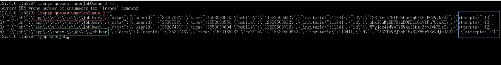 (2). 前面執(zhí)行完隊列加入成功后,可以本地使用redis客戶端通過lrange queues:userJobQueue 0 -1 查看隊列成員