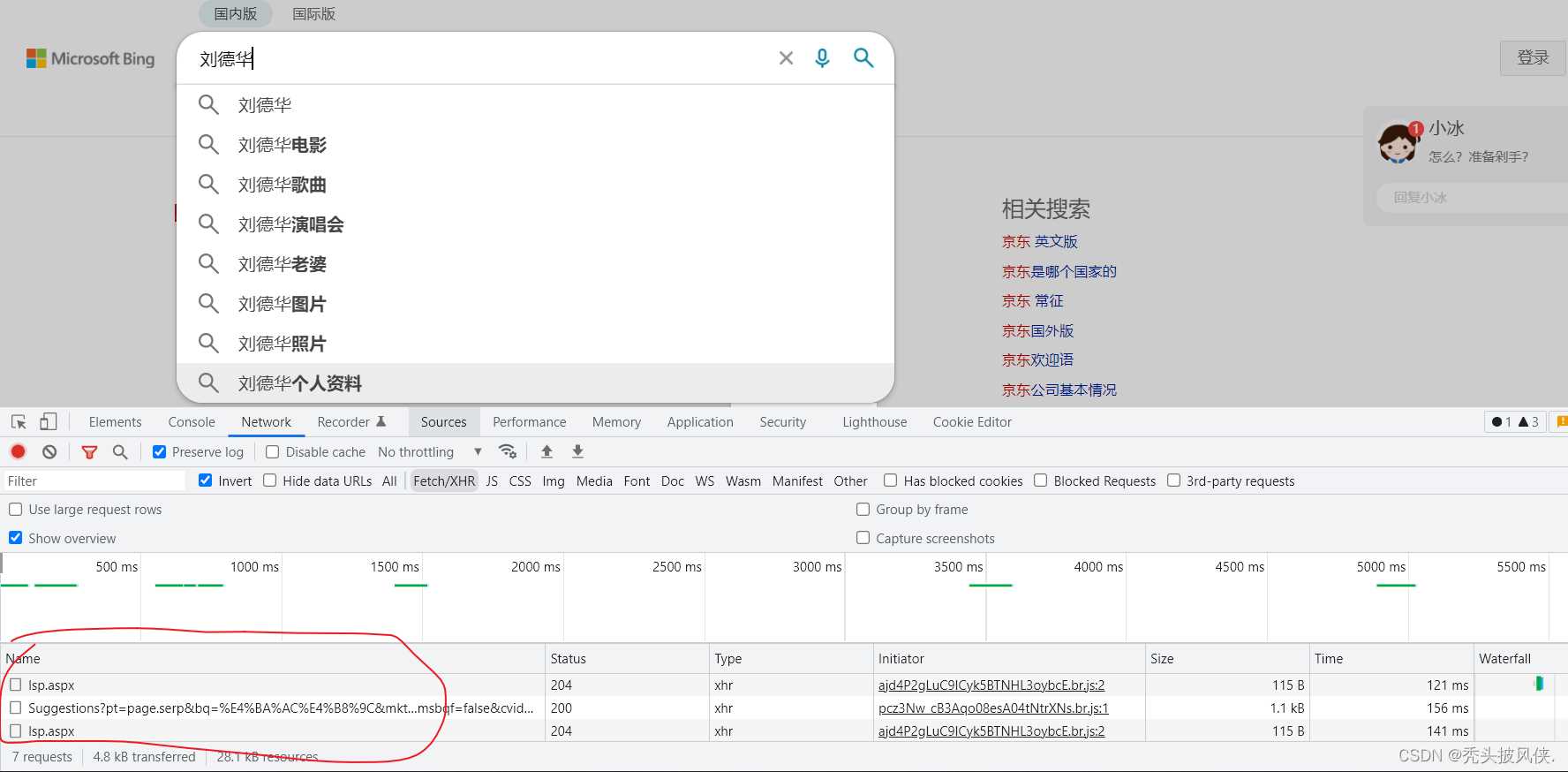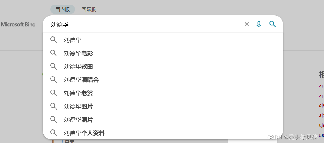 上面是一個搜索框,我們進行搜索的時候,下面就自動進行提示,這就是ajax的典型應用案例,我們只要輸入字符,那么就會發送ajax請求,服務器返回數據,頁面再進行展示。
