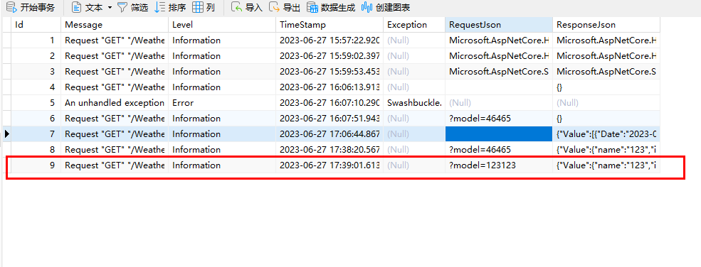 Message:日志信息Level:等級TimeStamp:記錄日志時間Exception:異常信息RequestJson:請求參數jsonResponseJson:響應結果json其中前面四種為日志默認,后兩種為我主動添加,在實際的設計中還有可能有不同的信息,如:
