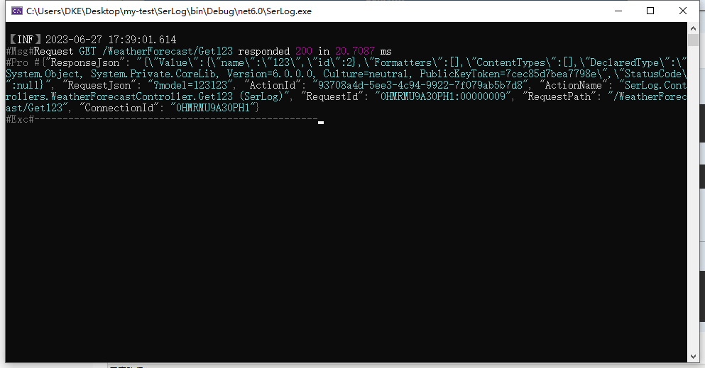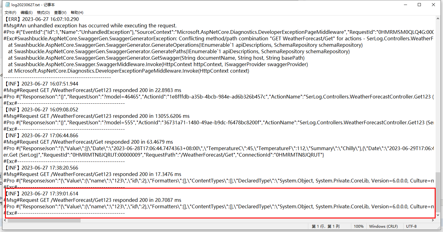 var builder = WebApplication.CreateBuilder(args);// Add services to the container.builder.Services.AddControllers(options =>{ options.Filters.Add(typeof(RequestLoggingFilter));});// Learn more about configuring Swagger/OpenAPI at https://aka.ms/aspnetcore/swashbucklebuilder.Services.AddEndpointsApiExplorer();builder.Services.AddSwaggerGen();builder.Host.AddSerilLog();var app = builder.Build();// Configure the HTTP request pipeline.if (app.Environment.IsDevelopment()){ app.UseSwagger(); app.UseSwaggerUI();}app.UseHttpsRedirection();app.UseAuthorization();app.MapControllers();app.Run();這里我設計的日志信息只包括了