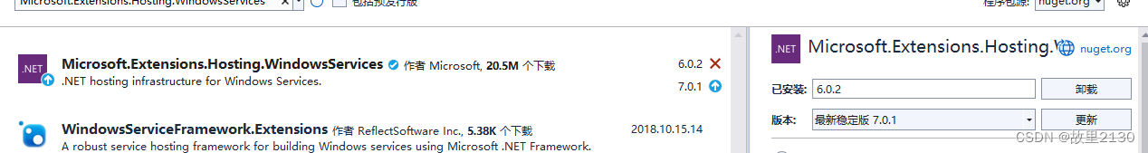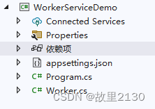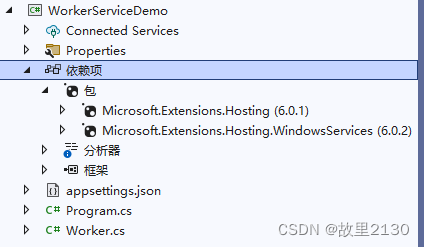 namespace WorkerServiceDemo{ public class Program {public static void Main(string[] args){ IHost host = Host.CreateDefaultBuilder(args) .UseWindowsService(options => { //給服務命名,在Windows服務中的會顯示名字 options.ServiceName = 'NET6故里2130'; }).ConfigureServices(services =>{ services.AddHostedService<Worker>();}).Build(); host.Run();} }}5.服務里面寫啟動,停止,以及執行任務,Worker.cs中寫