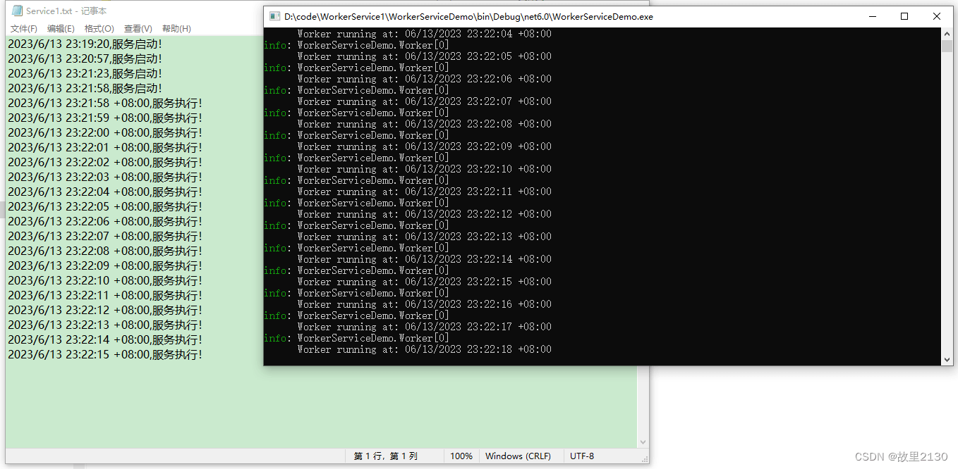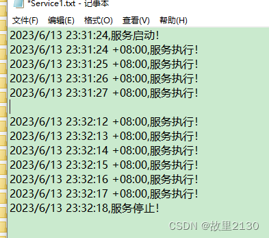 namespace WorkerServiceDemo{ public class Worker : BackgroundService {private readonly ILogger<Worker> _logger;private readonly string filePath = 'D:\\Service1.txt';public Worker(ILogger<Worker> logger){ _logger = logger;}/// <summary>/// 執行任務/// </summary>/// <param name='stoppingToken'></param>/// <returns></returns>protected override async Task ExecuteAsync(CancellationToken stoppingToken){ while (!stoppingToken.IsCancellationRequested) {_logger.LogInformation('Worker running at: {time}', DateTimeOffset.Now);using (FileStream stream = new FileStream(filePath, FileMode.Append))using (StreamWriter writer = new StreamWriter(stream)){ writer.WriteLine($'{DateTimeOffset.Now},服務執行!');}await Task.Delay(1000, stoppingToken); }}/// <summary>/// 服務啟動/// </summary>/// <param name='cancellationToken'></param>/// <returns></returns>public override Task StartAsync(CancellationToken cancellationToken){ using (FileStream stream = new FileStream(filePath, FileMode.Append)) using (StreamWriter writer = new StreamWriter(stream)) {writer.WriteLine($'{DateTime.Now},服務啟動!'); } return base.StartAsync(cancellationToken);}/// <summary>/// 服務停止/// </summary>/// <param name='cancellationToken'></param>/// <returns></returns>public override Task StopAsync(CancellationToken cancellationToken){ using (FileStream stream = new FileStream(filePath, FileMode.Append)) using (StreamWriter writer = new StreamWriter(stream)) {writer.WriteLine($'{DateTime.Now},服務停止!'); } return base.StopAsync(cancellationToken);} }}6.效果