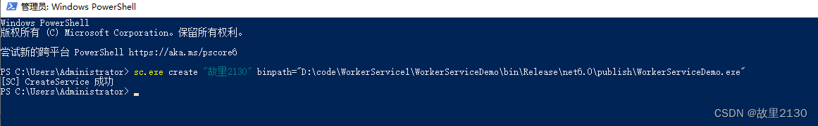 sc.exe create '故里2130' binpath='D:\code\WorkerService1\WorkerServiceDemo\bin\Release\net6.0\publish\WorkerServiceDemo.exe'