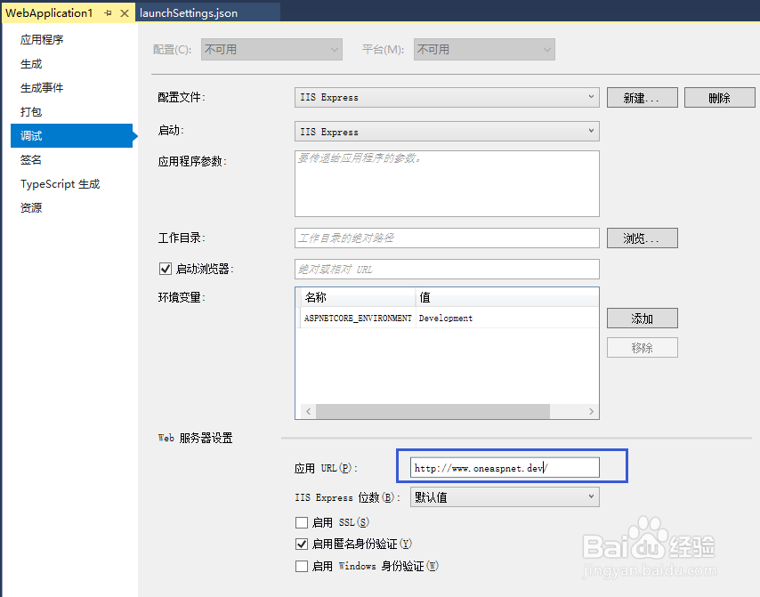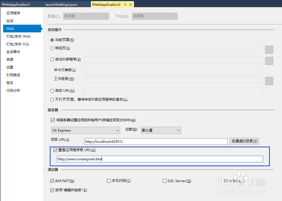 3、在項目上右鍵→屬性,選擇調(diào)試選項,修改應(yīng)用URL,如下圖所示: